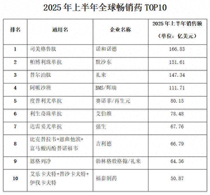 随着跨国药企相继披露2025年半年报,今年上半年的全球畅销药TOP10也随之出炉。诺和诺德旗下黑马司美格鲁肽继今年一季度反超“K药”(默沙东的帕博利珠单抗)后,今年上半年以1127.56亿丹麦克朗(按1丹麦克朗=0.14796美元计算,下同,合约166.83亿美元)的销售额,继续稳坐“药王”宝座。礼来的替尔泊肽作为“后起之秀”,已经追至第3位,上述三款创新药今年上半年销售额均破140亿美元。